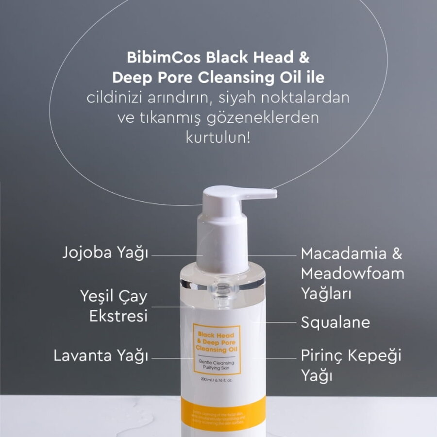Bibimcos Black Head and Deep Pore Cleansing Oil, cilt bakımında ilk adım olarak kullanılabilecek yağ bazlı bir temizleyicidir. Günlük kir, makyaj ve güneş kremi kalıntılarının arındırılmasına yardımcı olur. Su ile birleştiğinde süt formuna dönüşerek kolayca temizlenir ve ciltte ferahlık hissi bırakır. Özellikle yağlı ve karma ciltler için önerilse de farklı cilt tiplerinde de kullanılabilir.