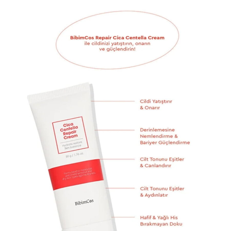 Bibimcos Cica Centella Repair Cream, Centella Asiatica (Gotu Kola) özü ve bitkisel yağlarla formüle edilmiştir. İçeriğindeki nemlendirici ve bariyer destekleyici bileşenler sayesinde cilt bakım rutinine uyum sağlayabilir. Düzenli kullanımda cildin daha yumuşak ve bakımlı hissedilmesine katkıda bulunabilir.