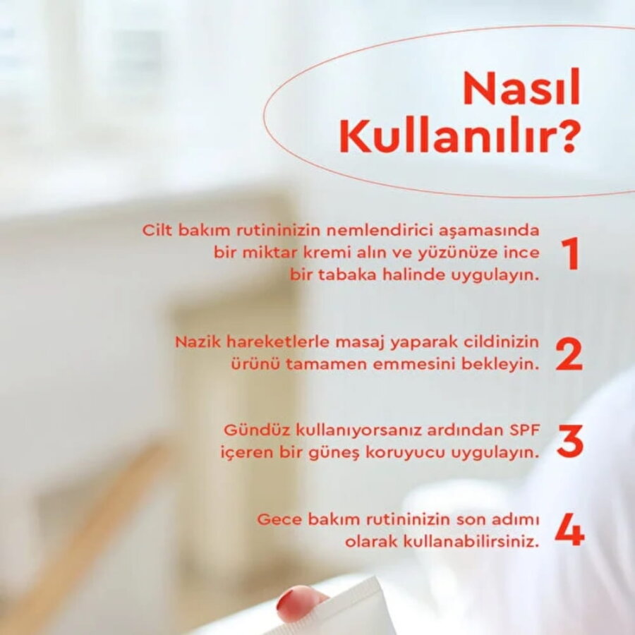 · Cildinizi yıkayıp kuruladıktan sonra, cilt bakım rutininizin nemlendirici aşamasında yeterli miktarda kremi yüzünüze uygulayın.