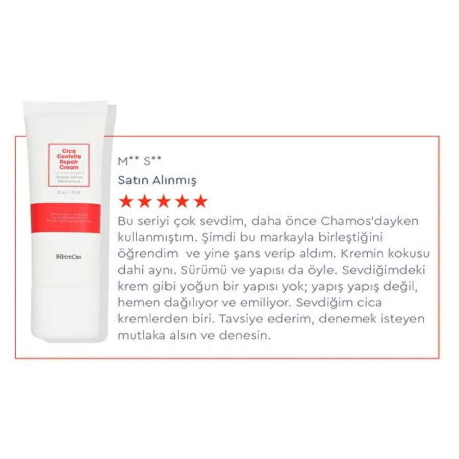 Bibimcos Cica Centella Repair Cream, içeriğindeki Centella Asiatica (Gotu Kola), Macadamia Yağı ve Shea Yağı gibi bileşenlerle formüle edilmiş, cildi nemlendirmeye ve bakım yapmaya yardımcı bir kremdir. Hafif dokusu sayesinde hızlı emilir ve ciltte yapışkan his bırakmadan nem desteği sağlamaya yardımcı olabilir.
