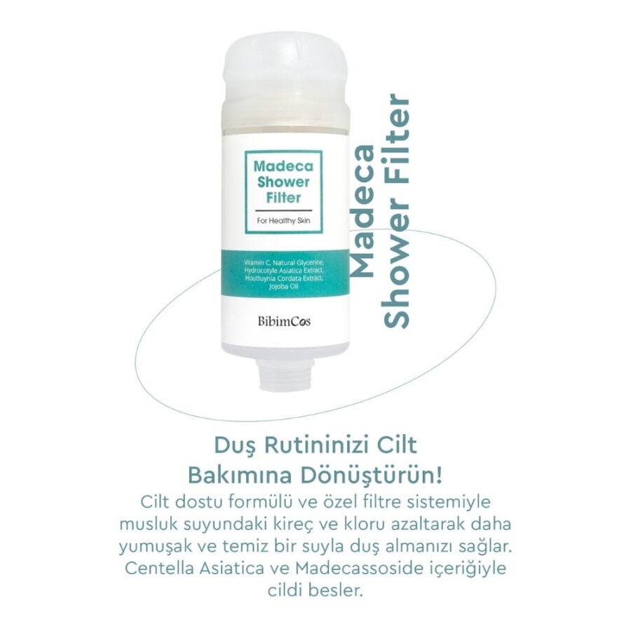 Bibimcos Madeca Shower Filter, duş sırasında kullanılan suyu destekleyici şekilde tasarlanmış bir filtredir. İçeriğindeki Centella Asiatica ve Houttuynia Cordata özleri ile duş deneyimini daha konforlu hale getirmeye yardımcı olur. Jojoba yağı ve vitamin jelleri ile formüle edilen yapısı sayesinde suyun ciltle temasında yumuşak bir etki sağlar. Ortalama kullanım süresi yaklaşık 2 ay olmakla birlikte, bu süre su basıncına göre değişiklik gösterebilir.