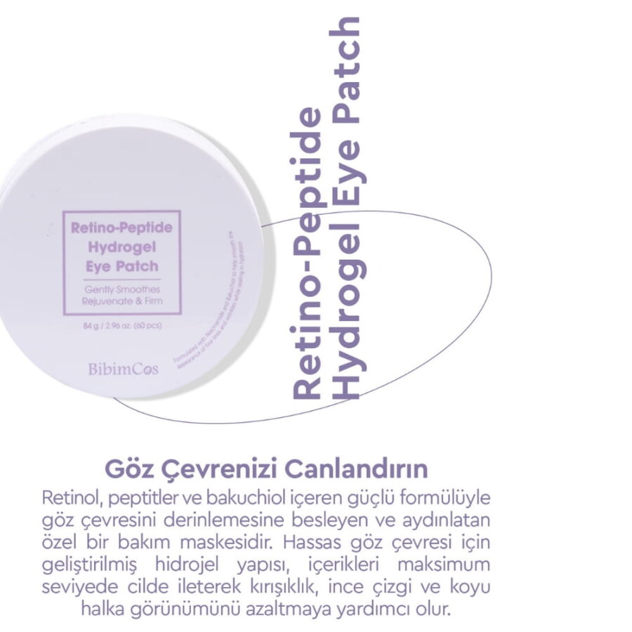 Bibimcos Retino-Peptide Hydrogel Eye Patch, göz çevresi için özel olarak tasarlanmış hidrojel bantlardan oluşur. İçeriğindeki bakuchiol ve niacinamide sayesinde cilde bakım yapmaya yardımcı olur. Hafif yapısı sayesinde cilt tarafından kolayca emilir ve konforlu kullanım sağlar. Düzenli kullanıldığında yüz ifadesi çizgilerinde ve boyun bölgesinde de uygulanabilir.
