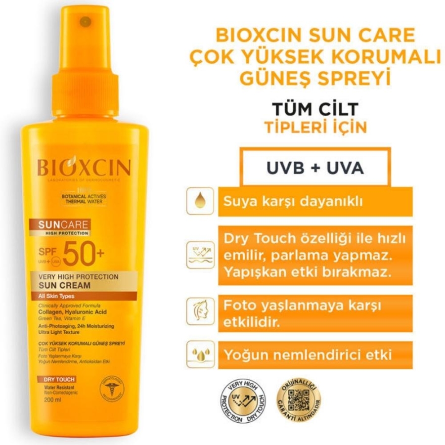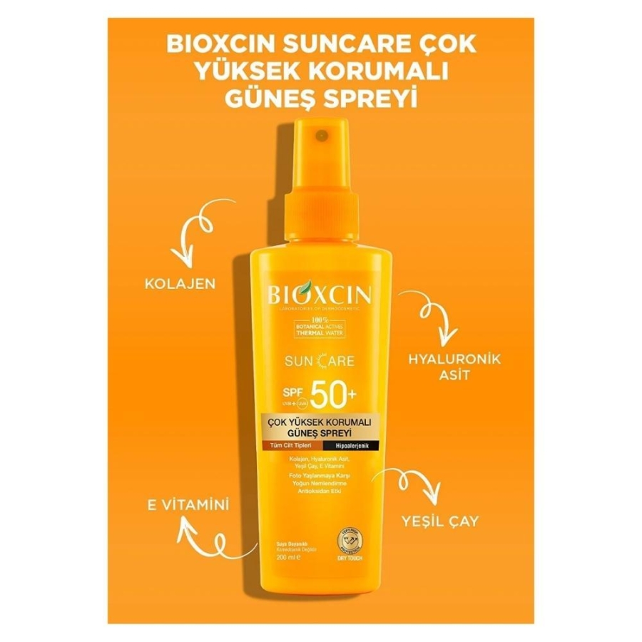 Bioxcin Sun Care Çok Yüksek Korumalı Güneş Spreyi, tüm cilt tipleri için geliştirilmiş, pratik kullanıma sahip bir güneş koruyucudur. SPF 50+ içeriğiyle cildi güneşin zararlı UVA ve UVB ışınlarına karşı etkili bir şekilde korur.