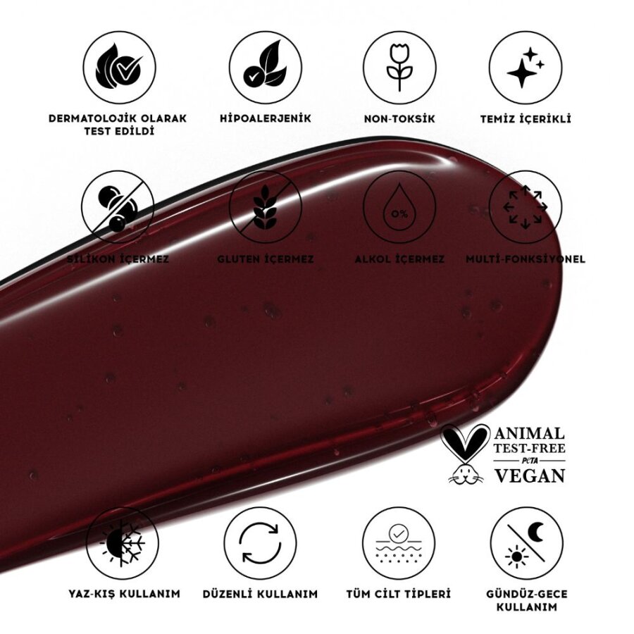 Hyaluronik asit dudaklara yoğun şekilde nem verirken, seramid ve besleyici yağlar bariyerini güçlendirir. Şeftali‑vişne pigmentleri dudak çizgilerini hafifçe renklendirirken dudaklara pürüzsüz bir görünüm kazandırır. Şeffaf glos parlaklığı ile hafif renk verirken yapışkan veya yağlı his bırakmadan uzun süre kullanım imkânı sunar.