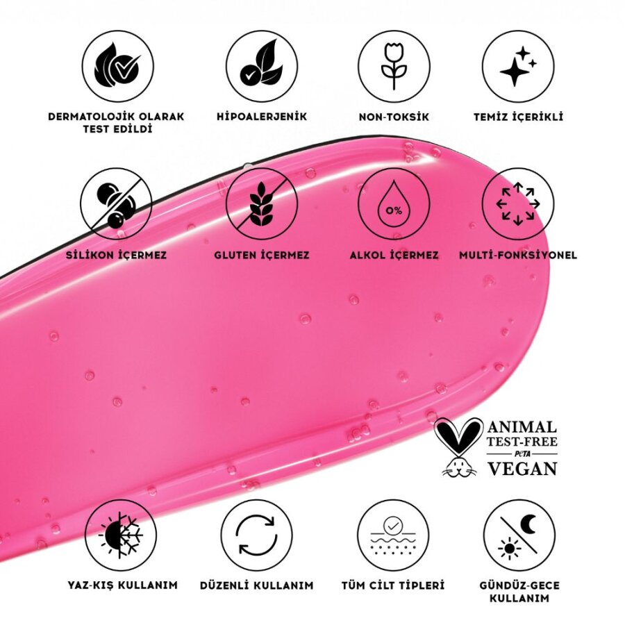 Yüksek nemlendirme özelliği taşıyan hyaluronik asit ile dudaklara dolgunluk katarken, seramid ve bitkisel yağlar dudak bariyerini destekler. Bubblegum pigmenti dudaklara doğal ve pürüzsüz bir renk verirken, glos benzeri parlaklık da extra boyut katar. Yapışkan değil, nazik bir his bırakarak rahat kullanım sağlar.