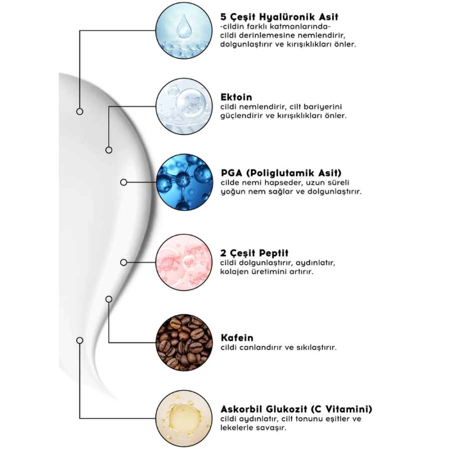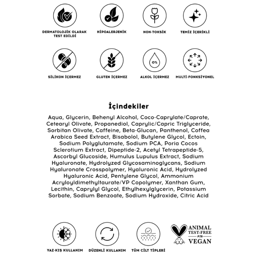 Göz çevresinde nemi uzun süreli olarak hapseder ve dolgunlaştırır. Vitamin C ve kafein ile aydınlatıcı ve canlandırıcı etki sunar. Peptit ve hyaluronik asit bileşimleri sayesinde ince çizgilerin görünümünü azaltmaya yardımcı olur. Hafif, hızlı emilen yapısıyla ağırlık ve yapışkanlık hissi bırakmaz. Düzenli kullanımda göz çevresi daha aydınlık, taze ve sağlıklı bir görünüm kazanır