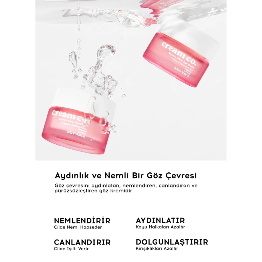 Cream Co. Peptide Glow Eye Göz Kremi, vitamin C ve kafein içerikli formülüyle göz altı morluklarını ve şişkinliği azaltmaya yardımcı olan nemlendirici bir bakım ürünüdür. Peptide Glow Eye Göz Kremi, iki çeşit peptit, beş farklı hyaluronik asit, ectoin ve poliglutamik asit içeren yapısıyla göz çevresine yoğun nem sağlar, aydınlık ve dolgun bir görünüm kazandırır.