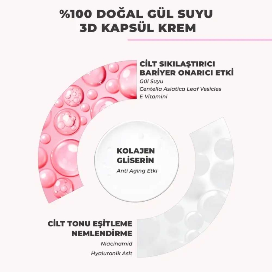 Dermokil %100 Doğal Gül Suyu Canlandırıcı Yenileyici 3D Kapsül Krem 50ml ÖZELLİKLERİ