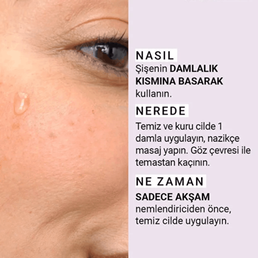 Kullanım Önerisi: Koyu bölgelere 1 ya da tüm yüze 3-4 damla şekllinde sabah ve akşamları nemlendirici kreminizden önce uygulayın.