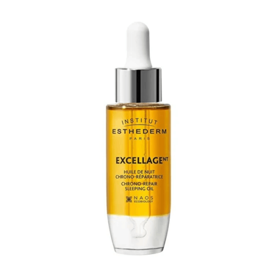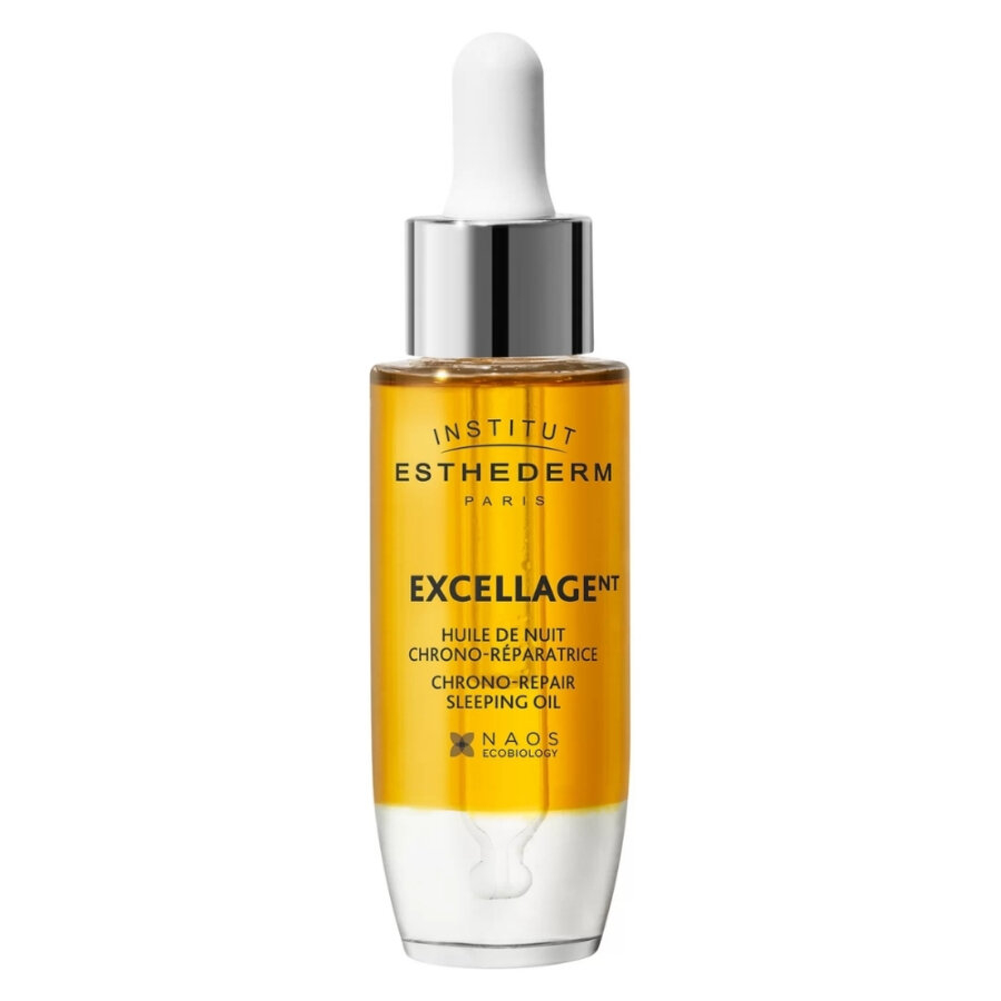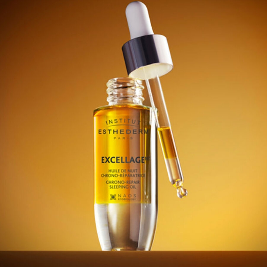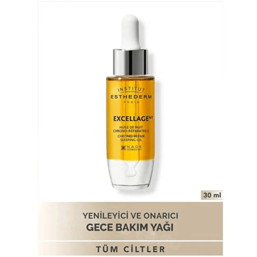 Esthederm Excellage Chrono-Repair Sleeping Oil, yaşlanma belirtilerine karşı gece boyunca etkili bakım sunar, cildin onarım sürecini destekler ve sabahları daha canlı bir görünüm sağlar.