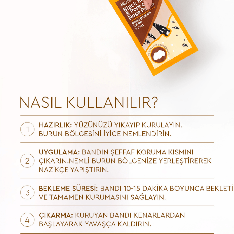Kullanım Şekli: Yüzünüzü yıkayın temizleyin Burun çevrenizi su ile ıslatın. Ardından bandın şeffaf kısmını eliniz ile çıkarın. Burun şeklinize göre burnunuza yerleştirin. 10-15 dakika kadar bekleyin. Kenarlardan başlayarak yavaşça kaldırın. Haftada 1-2 kez kullanabilirsiniz.