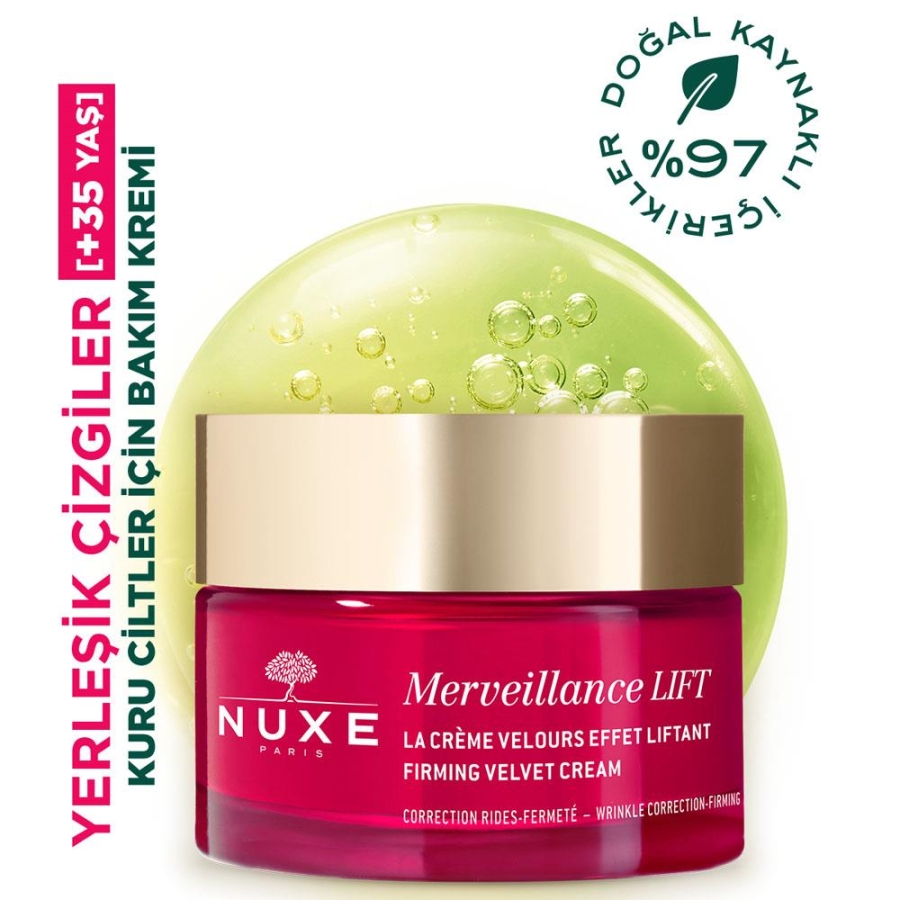 Nuxe Merveillance Lift Kadife Dokulu Gündüz Bakım Kremi, cildin ihtiyaç duyduğu nemi ve besini sağlayarak yaşlanma belirtilerine karşı etkili bir bakım sunar. Yenileyici mikro alg yağı ile zenginleştirilen formülü, kırışıklık görünümünü azaltmaya, cildi sıkılaştırmaya ve daha dolgun bir görünüm kazandırmaya yardımcı olur. Kadifemsi dokusu sayesinde kolayca emilir, cilde pürüzsüz ve yumuşak bir his bırakır. %97 doğal içerikli ve Fransa’da formüle edilen bu krem, çiçeksi ve misk notalarıyla duyusal bir bakım deneyimi sunar.