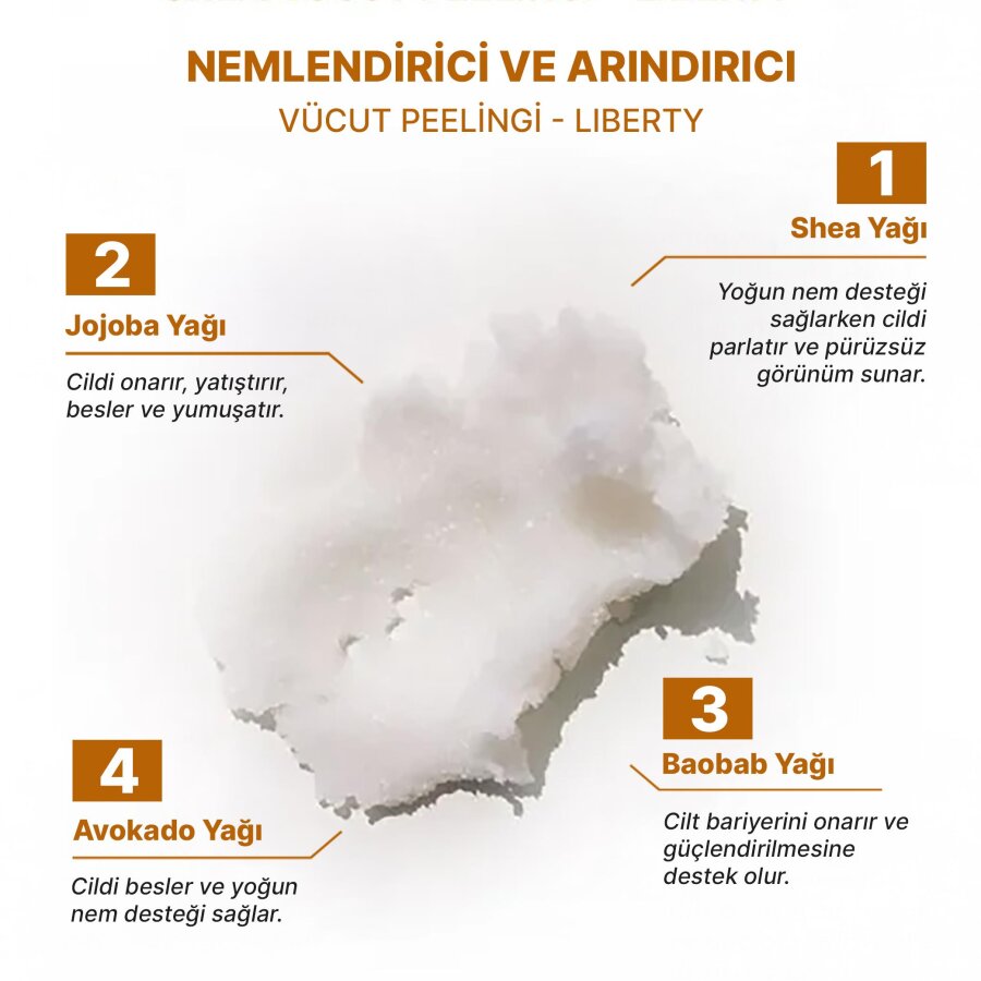 The Bath Factory Liberty Vücut Peelingi, ölü derileri kolayca arındıran etkili formülüyle cildini yenilerken, shea, jojoba, baobab ve avokado yağlarından elde edilen eşsiz harmanı sayesinde cildini derinlemesine nemlendirmeye yardımcı olur.