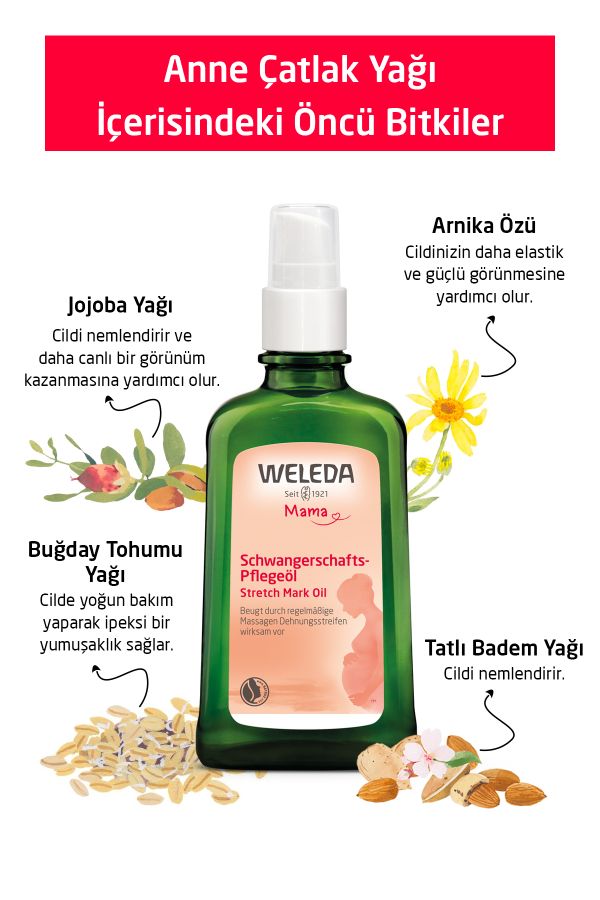 Bu besleyici yağ, düzenli masajla cildin elastikiyetini artırarak hamilelik sırasında ve sonrasında çatlak oluşumunu önlemeye yardımcı olur. Arnika çiçeği özü, tatlı badem yağı ve buğday tohumu yağı gibi doğal içeriklerle cildi yumuşatır ve yoğun şekilde nemlendirir.