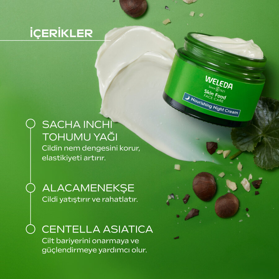 Cildiniz gece boyunca yenilenirken ihtiyacı olan yoğun bakımı Skin Food Nemlendirici ve Besleyici Gece Bakım Kremi ile sağlayın. Omega-3 açısından zengin sacha inchi yağı, skualen ve centella asiatica (Cica) formüle edilen zengin içeriği, cilt bariyerini güçlendirir, nem kaybını önler ve cildin doğal yenilenme sürecini destekler.
