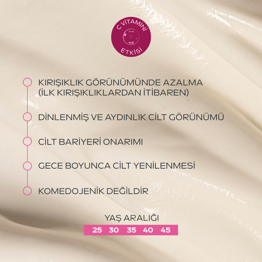 Kullanım Tavsiyesi: Tüm cilt tiplerinin kullanımına uygundur. Gece bakım rutininde, önceden temizlenmiş yüz, boyun ve dekolte bölgesine uygulanır. Günlük kullanım için uygundur.